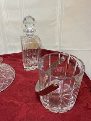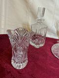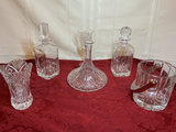 A collection of cut-crystal glassware including multiple decanters with stoppers, a decorative patterned vase, and an ice bucket with a handle. These are crystal to the best of our knowledge.