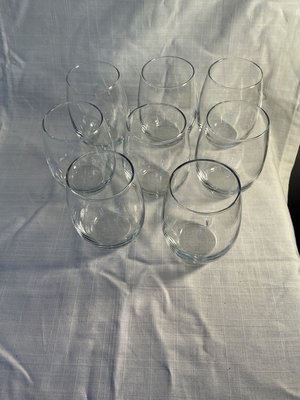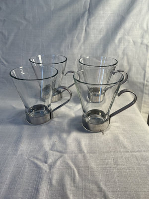Clear glass drinkware including eight stemless tumblers and four double-walled mugs with metal bases and handles.