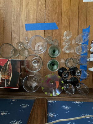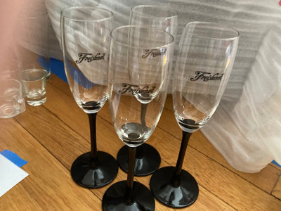 A collection of glassware including a four-piece Spirit 6oz champagne flute set, several green-stem champagne/wine glasses, clear wine and cocktail glasses, small tumblers and mugs, and a few decorative or specialty glasses.