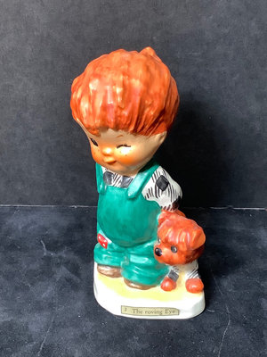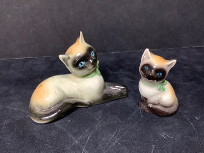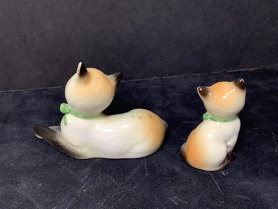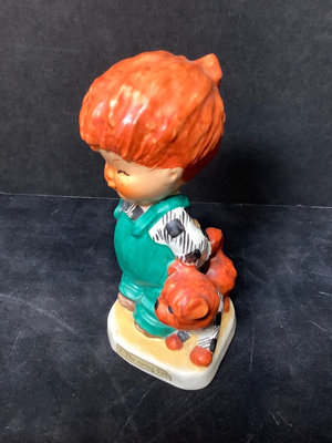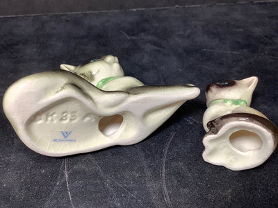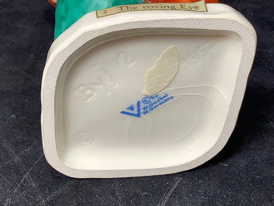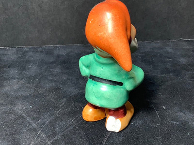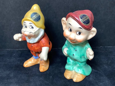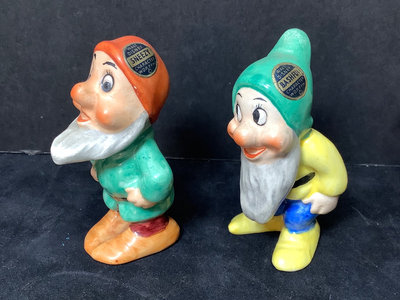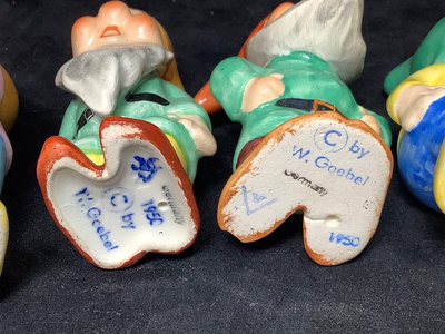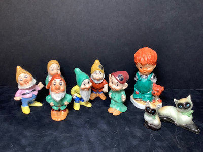 Vintage Goebel. Six of the Seven Dwarfs in collaboration with Walt Disney, 1950, Happy has small chip on hat, Sneezy has large chip out of heel, made in Germany, 3h. Charlot Byi no.2 The Roving Eye, 1957, by Goebel, W. Germany, 4.5h. Goebel Siamese cat CK35A and kitten CK35B, made in W. Germany, 2h. All have areas of light crazing. 9 pieces.