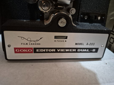 Vintage GOKO Editor Viewer Dual-8 film viewing device (Model A-203) with a small viewing screen, focus control, film-loading mechanism, lens assembly, and power cord. UNTESTED, as is as found. ** BRING OWN PACKING MATERIALS