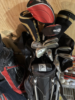 A golf bag filled with irons, woods, and headcovers, along with towels and other golf accessories. Callaway included