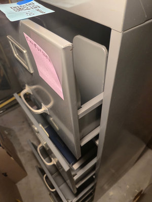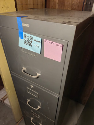 A gray metal filing cabinet with four drawers and metal handles. **BRING HELP TO MOVE OUT OF BASEMENT