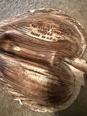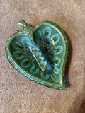 A vintage green glazed ceramic ashtray in a heart shape featuring a raised leaf/flower pattern and a ribbed central rest. The underside is stamped Treasure Craft, Made in U.S.A., and the piece measures roughly 11 inches by 8 inches.