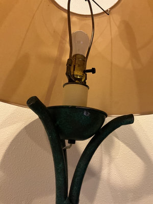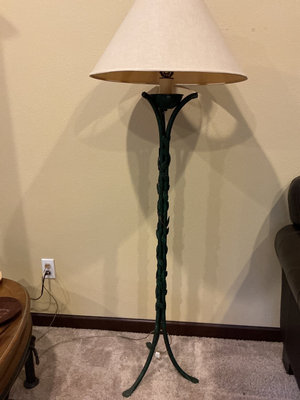 A tall green metal floor lamp with a braided vine motif, three curved legs, and a beige fabric lampshade. 62 inches tall.
