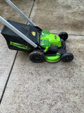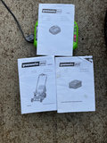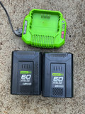 Greenworks Pro 60V self-propelled lawn mower accompanied by two lithium-ion batteries (2.0 Ah and 4.0 Ah), a charger, and printed manuals. Tested