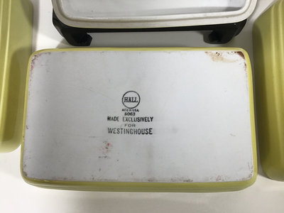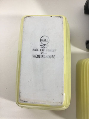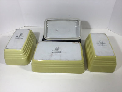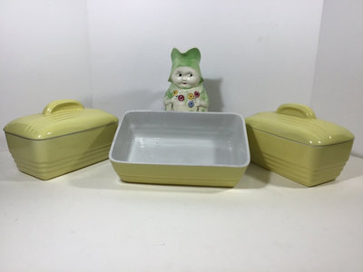 Hall yellow casserole dish 10.25x6.5x3. Covered dishes 9x5.5x6.5. Jug, unmarked, 8.5h. 6 pieces.