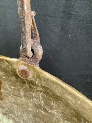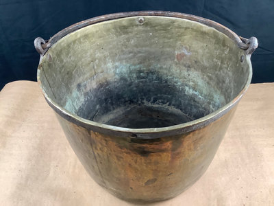 Large copper caldron with hammered steel ring and handle. 19d x 13h. Condition consistent with age and use. 1 piece.