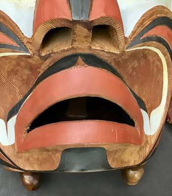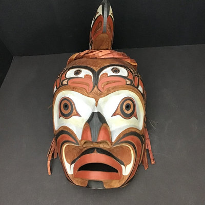 Large northwest coastal indigenous mask, hand carved and painted wood, 9x12.5x16. 1 piece.