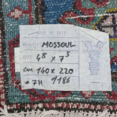 Vintage Mossoul (variation on spelling Mussel, Mousel, or Mosul) rug, a tribal carpet made in the Kurdish nomadic districts of northwestern Iran. Reds, blues, and browns are colorfast, but in need of a cleaning. 56x87 (approx 5ft x 7ft). Made in Iran. 1 piece.