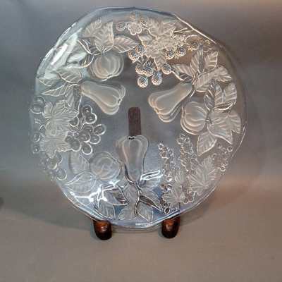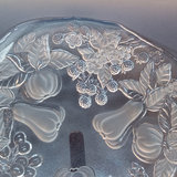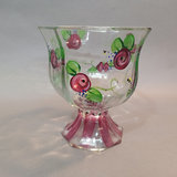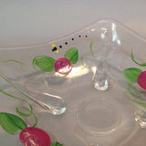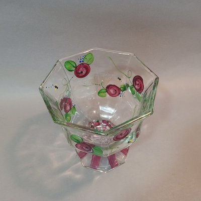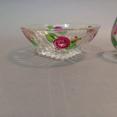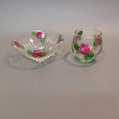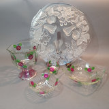 Hand painted glass pieces featuring roses and bee design, each signed Lani, includes 6.25h footed bowl, 4.75h small bowl, 4.75sq sqare bowl, and 2.5h tealight votive holder. Glass cake plate with frosted fruit design, 14.25d. 5 pieces.