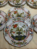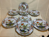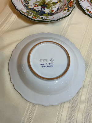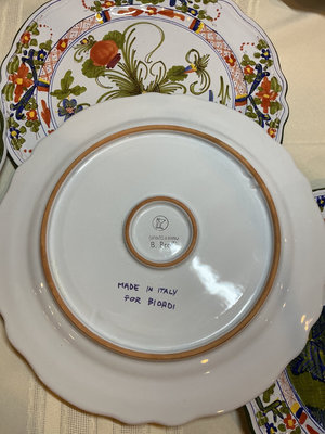 A collection of hand-painted ceramic dishes with scalloped edges, featuring multicolor floral and landscape motifs. The backs are stamped with 'Dipinto a Mano' and 'Made in Italy for Biordi'. Four dinner plates and four soup bowls.