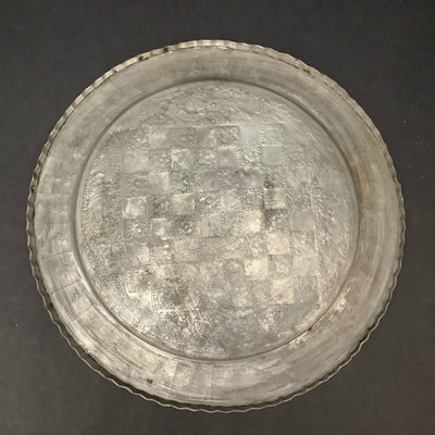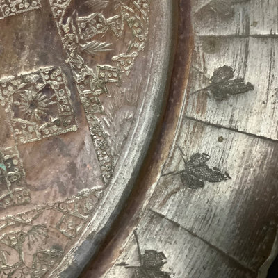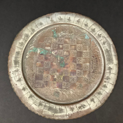 Handmade brass chess set on ornately decorated brass tray 16d. 33 pieces.