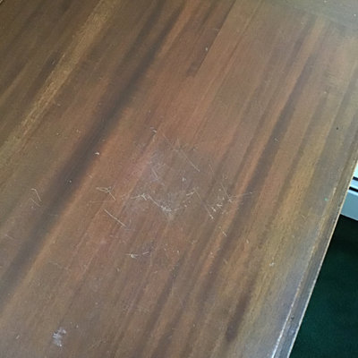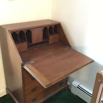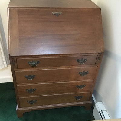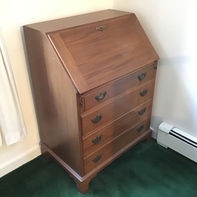Petite wood secretary made in 1999, handmade and numbered by the Charuck Furniture Co. Scratched interior work surface from frequent use, and brass hardware, 28x18.5x39.5. Heavy, bring help and appropriate vehicle to pickup. 1 piece.