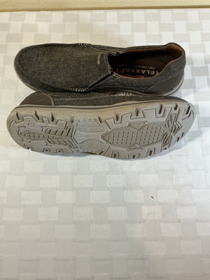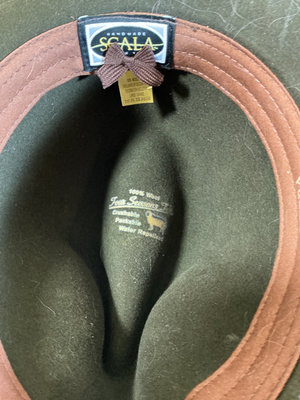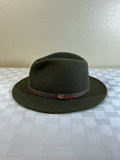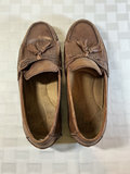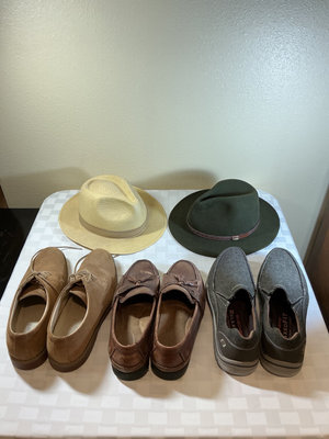 A collection of fashion accessories and footwear consisting of two hats (straw fedora and dark green felt) and several pairs of shoes in brown, tan, sized 11-12. Plus a brand new pair of Skechers sized 13 never worn.