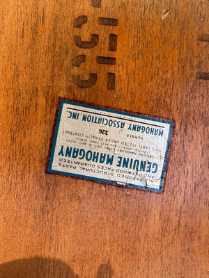 Genuine mahogany tables with gold embossed inlaid learher tops . 21.5”, 19”, 16.5” wide respectively . Tallest is 24”tall