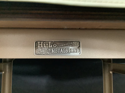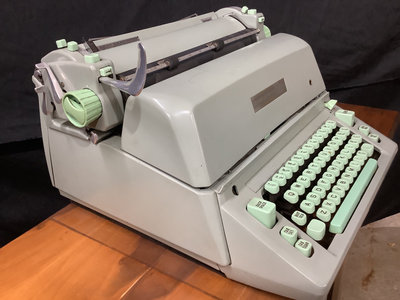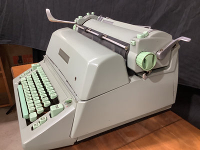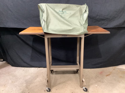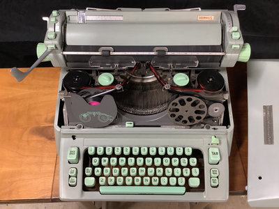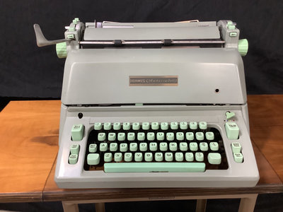 Hermes B1-C ambassador typewriter, made in Switzerland. Includes vinyl cover and Hi-Lo brand typing desk, 36x12x27. Works. 2 pieces.