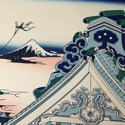Katsushika Hokusai (Japanese, 1760-1849). Woodblock print of "Asakuna Honganji Temple" from Thirty-Six Views of Mt. Fuji, matted in folio. 1 piece.