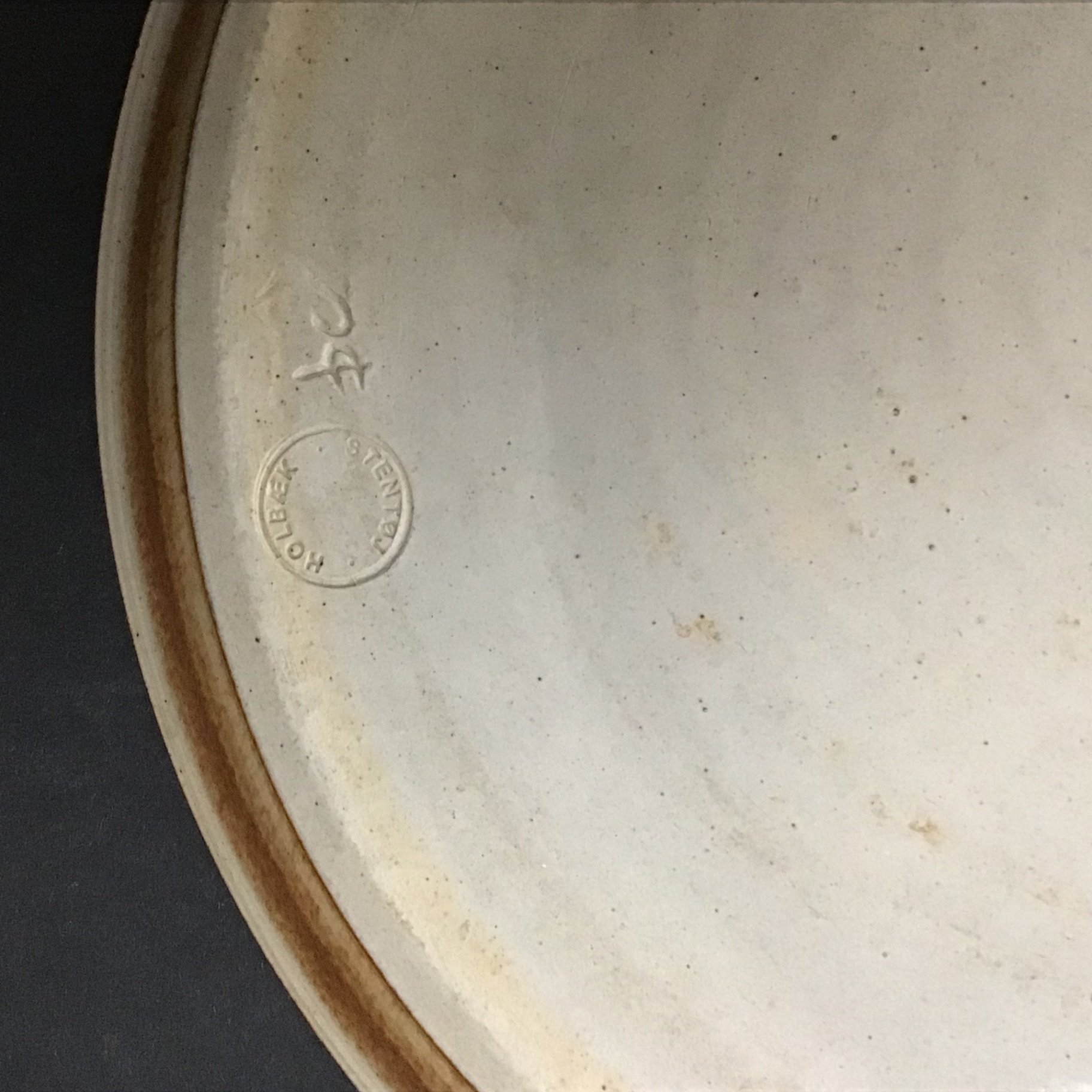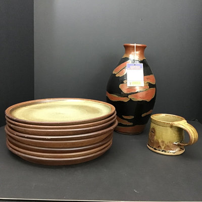 Holback Stentaje dinner plates, several with scrapes or small chips on rim, 10d (8). Shiwan handmade vase, 10.5h. Hand thrown mug. 10 pieces.