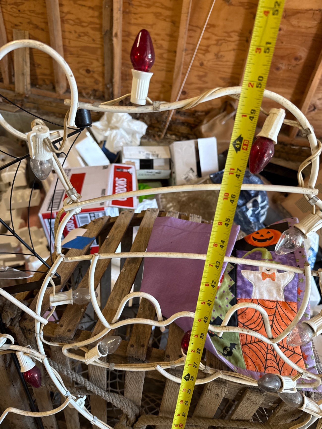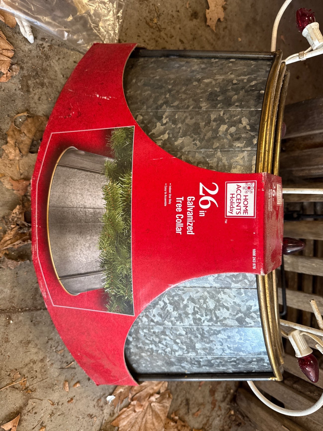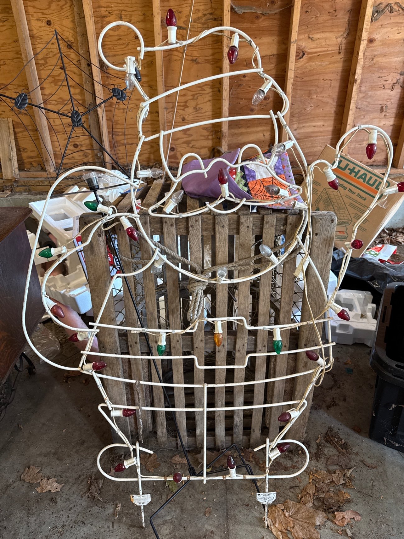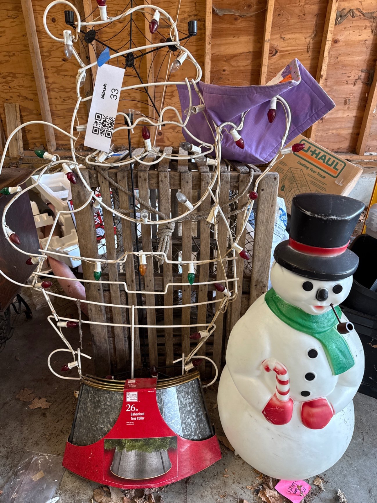 Includes a white metal lighted wireframe sculpture with multicolor bulbs, a large snowman figure with scarf and pipe, a Halloween-themed patchwork quilt with 'BOO' lettering and spiderweb designs, and a red box for a 26-inch galvanized tree collar, along with a metal stand and other miscellaneous decor items. Located in garage.