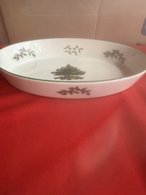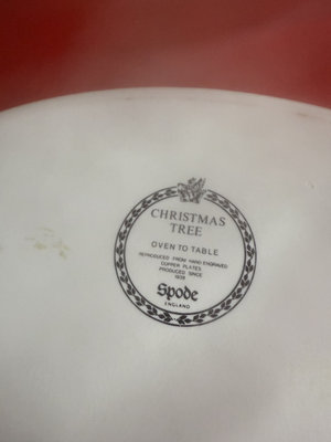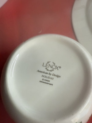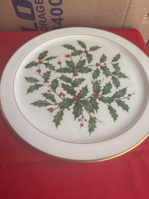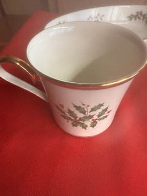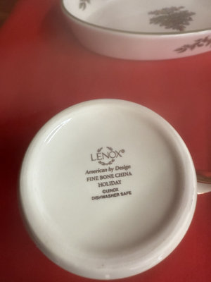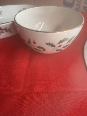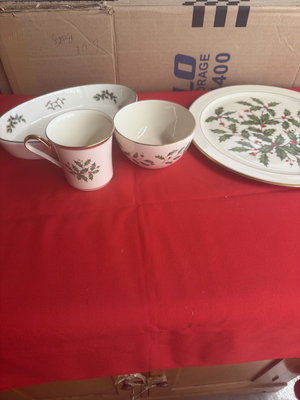 A collection of holiday dinnerware including Lenox Holiday bone china cup and small bowls with holly sprigs, a large plate and a shallow dish featuring holly and a central Christmas Tree motif, all from Christmas Tree and Holly-pattern patterns.