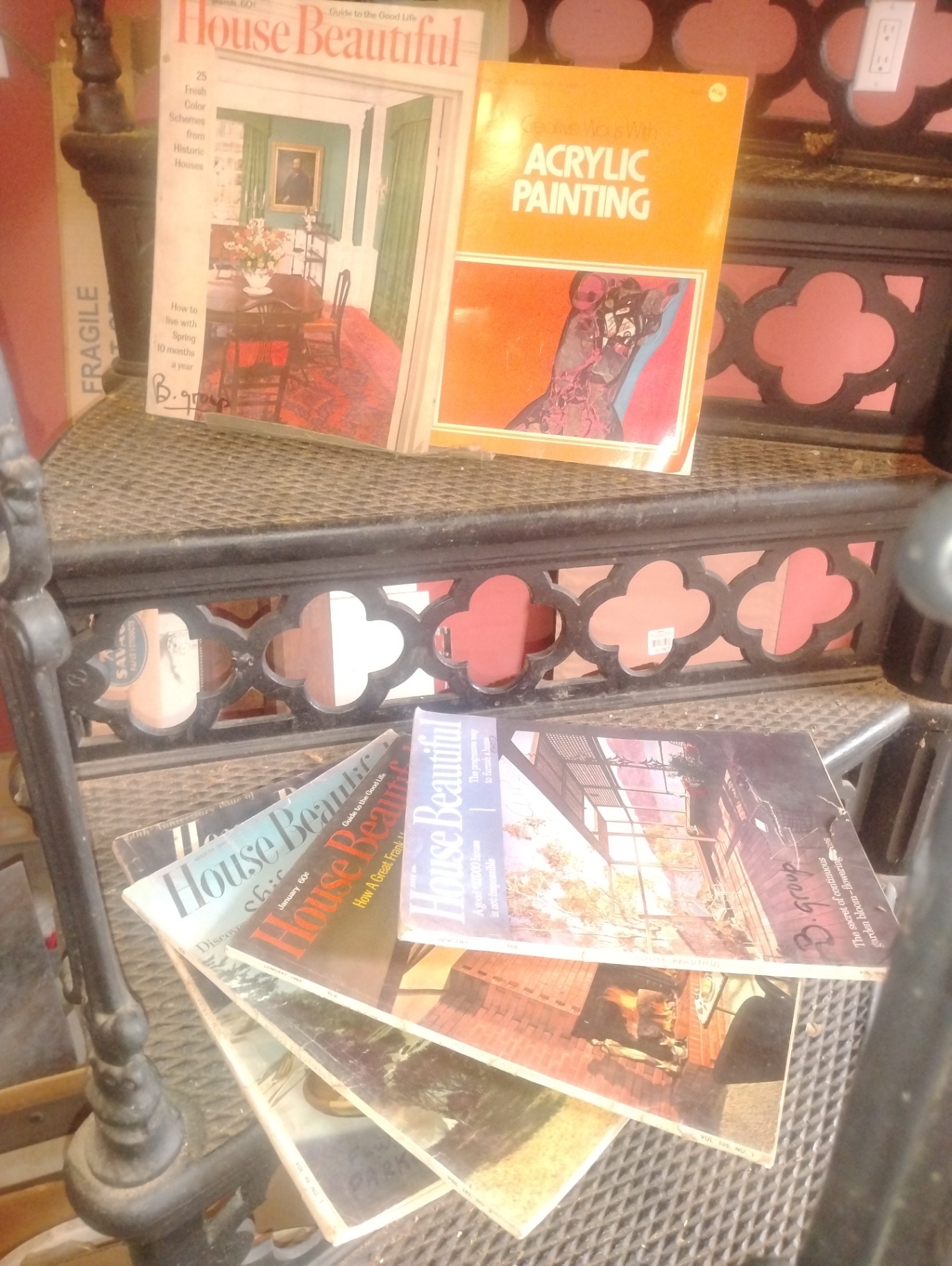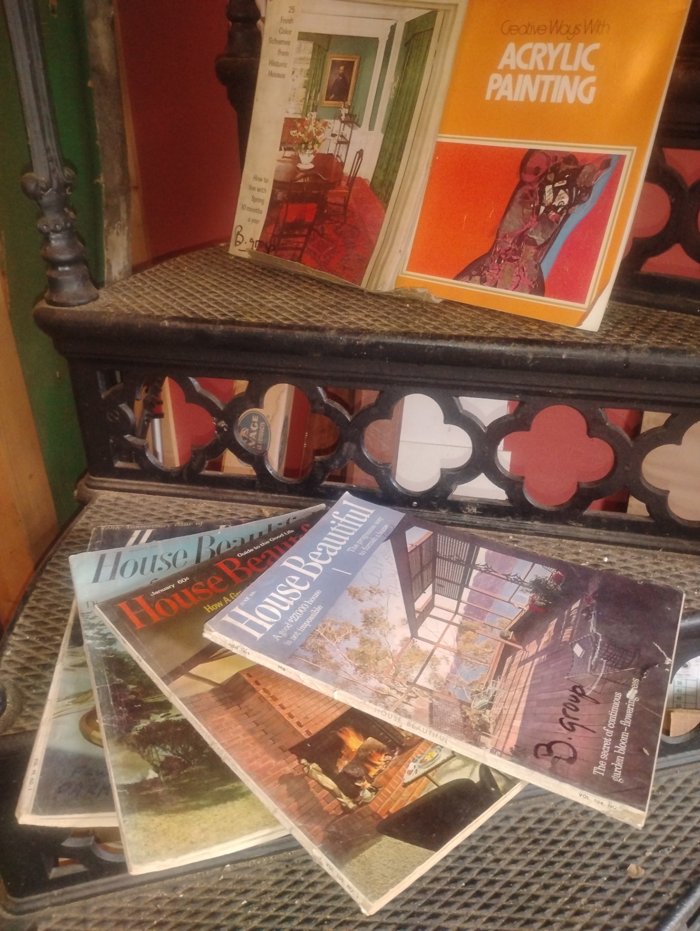 A collection of House Beautiful magazines and an acrylic painting booklet.