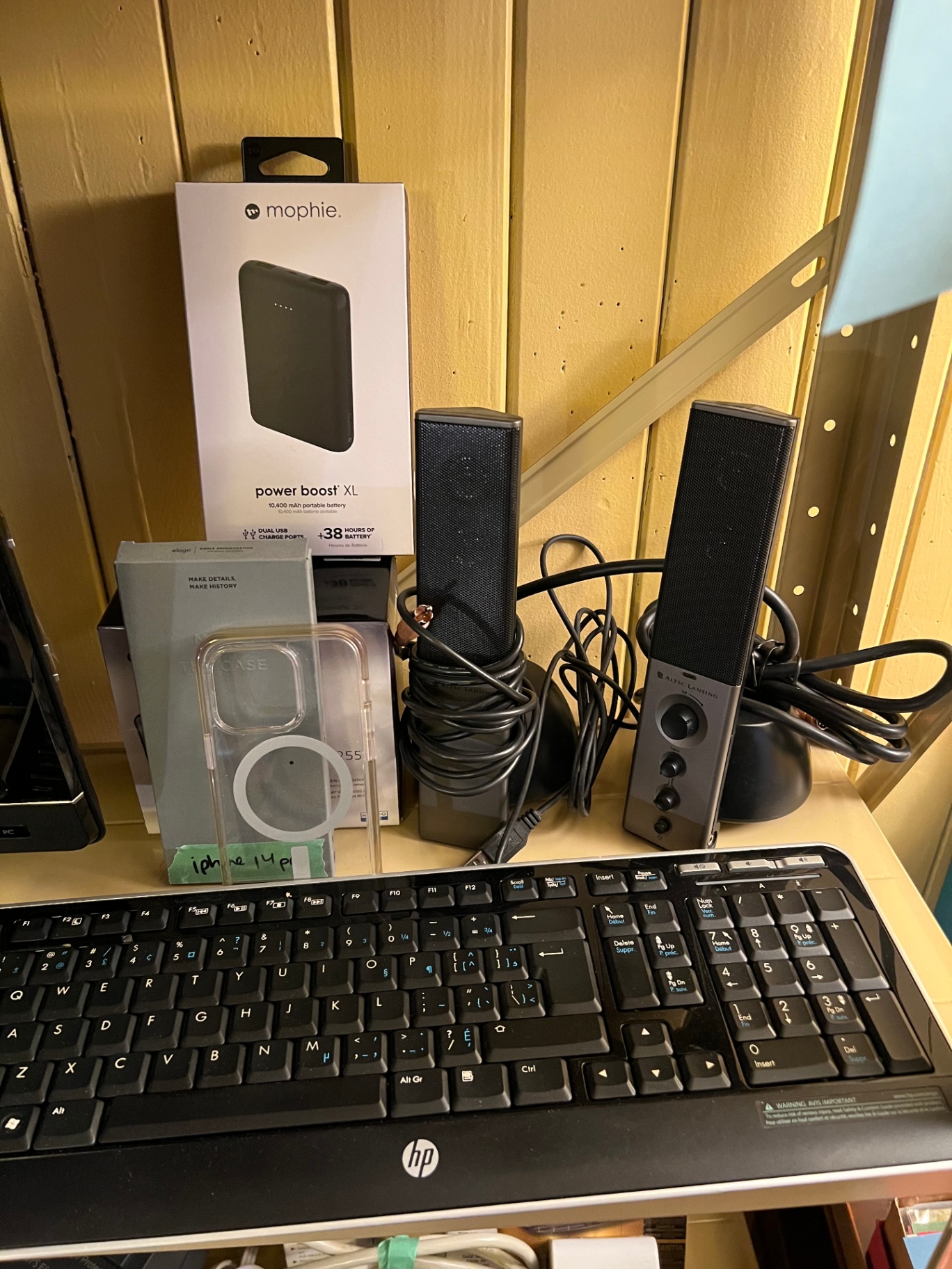 A desktop computer setup featuring an HP monitor with keyboard and mouse, surrounded by various cables, speakers, power adapters, and iPhone accessories (iPhone 14 Pro is BOX ONLY and not included in lot). New Mophie Power Bank with original box. Shelf above & below NOT included. Shelf not included ** BRING OWN PACKING MATERIALS.