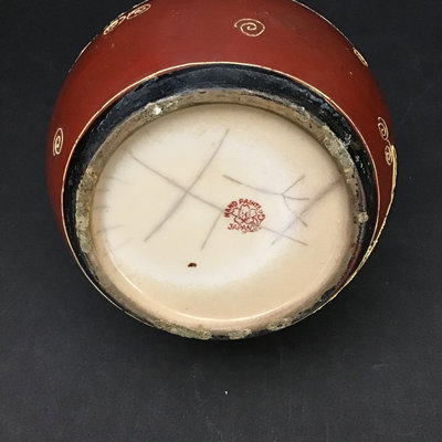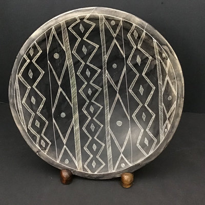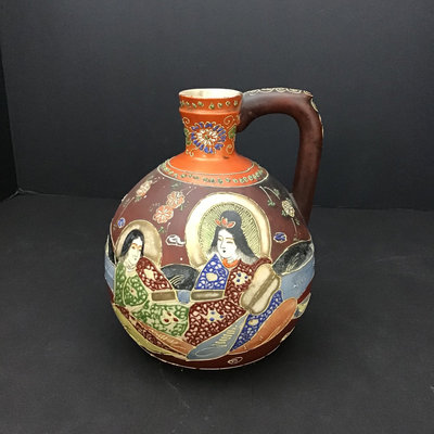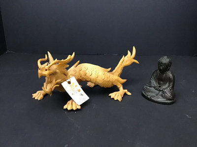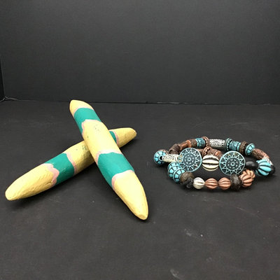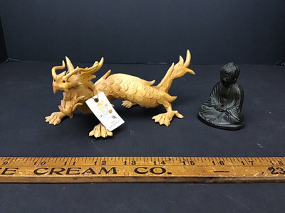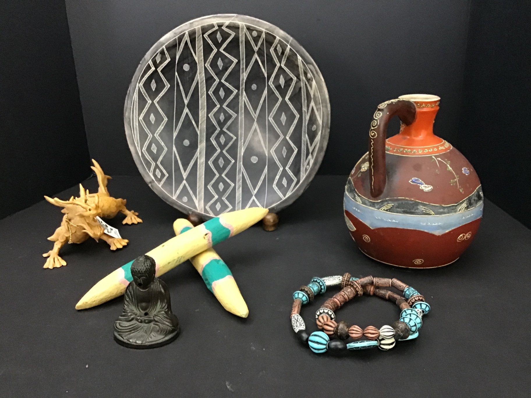 African soapstone dish, 10d. Japanese hand painted ceramic saki bottle, no top, 7.5h. 22in beaded necklace, unknown origin. Handcrafted wood dragon, 8w. Pair of yellow wood clap sticks, possibly Australian, 9w. Hollow metal Buddha statue / incense burner, 3.5h. 6 pieces.