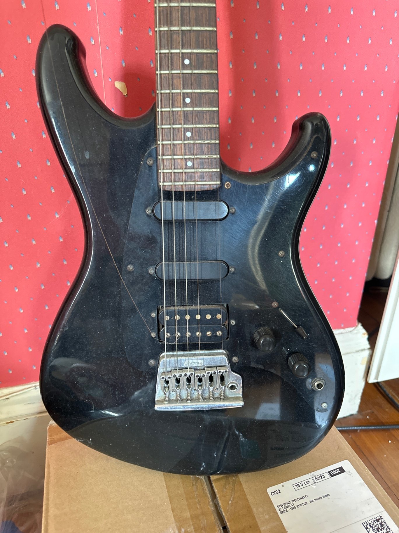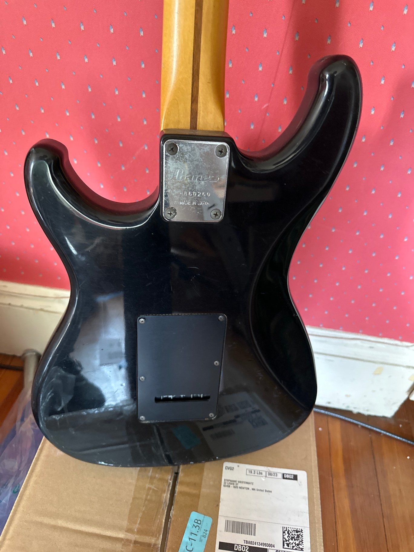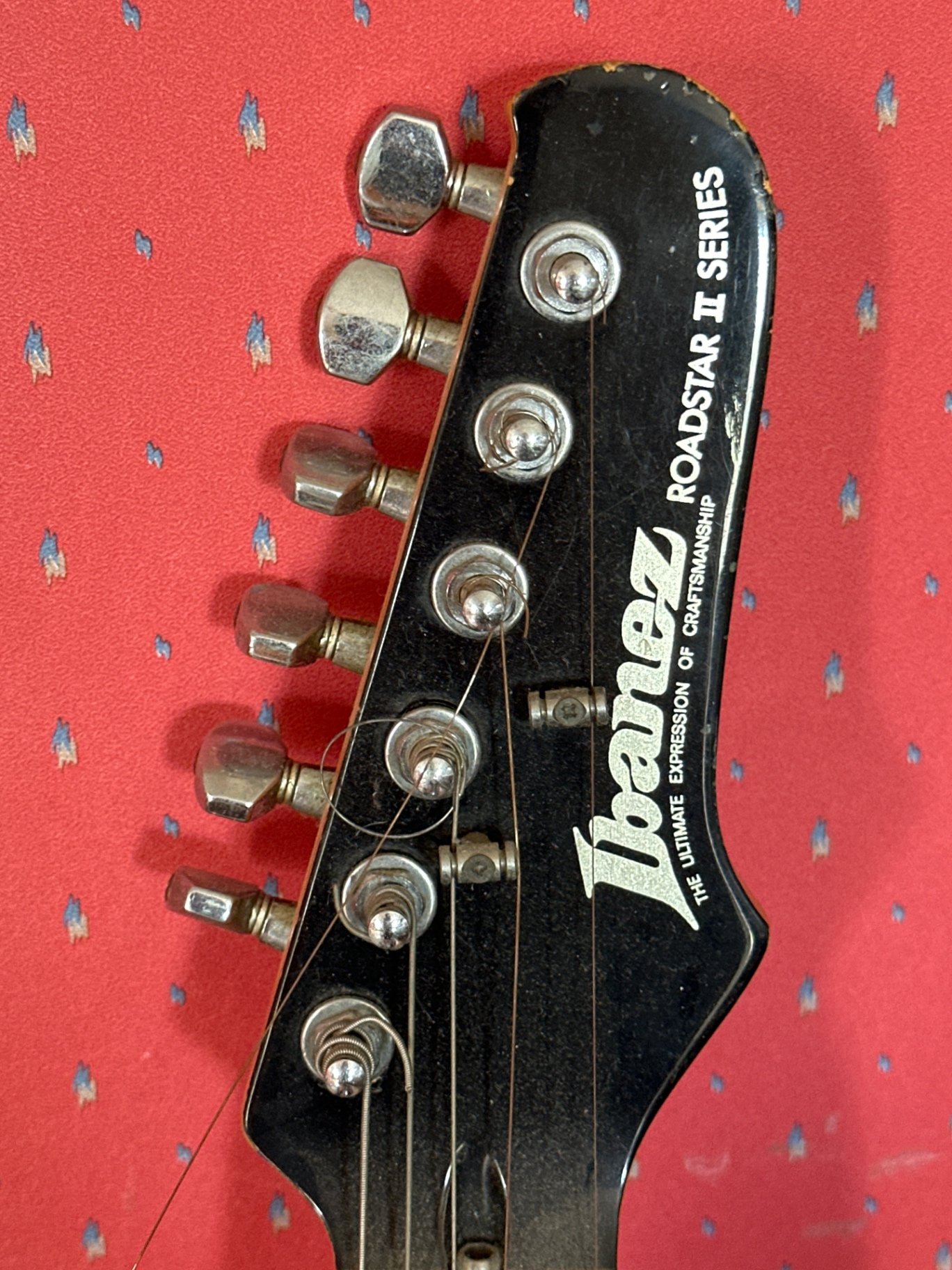 A black Ibanez Roadstar II Series electric guitar with a bolt-on maple neck, six-in-line tuners, three pickups, a tremolo bridge, and a rear control cavity plate. Note, string needs repair.