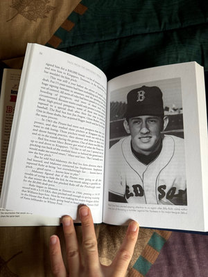 A baseball-themed book about the Boston Red Sox, featuring a cover image of the team and players, a back-cover description with Yaz photo