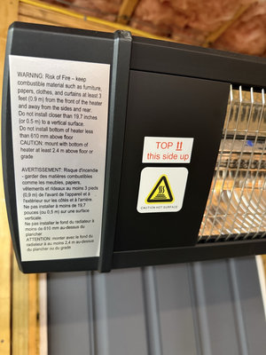 A black infrared heater mounted on an adjustable tripod stand with a power cord and warning labels; a separate QR-code label is present nearby.