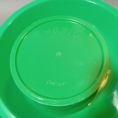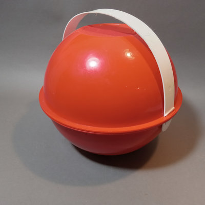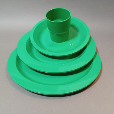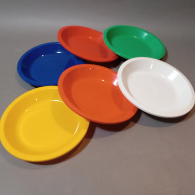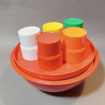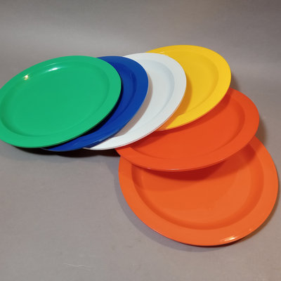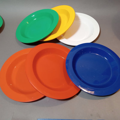Vintage plastic Ingrid dinnerware, fits in a handled dome for travel. Set of 6 multi-colored, missing one blue cup. Dome 10.5d x 9.5h. Bowls 6.75d x 1h, plates 8.5d, plates 9.25d, cups 3h, tray, 9.5d. 1 piece.