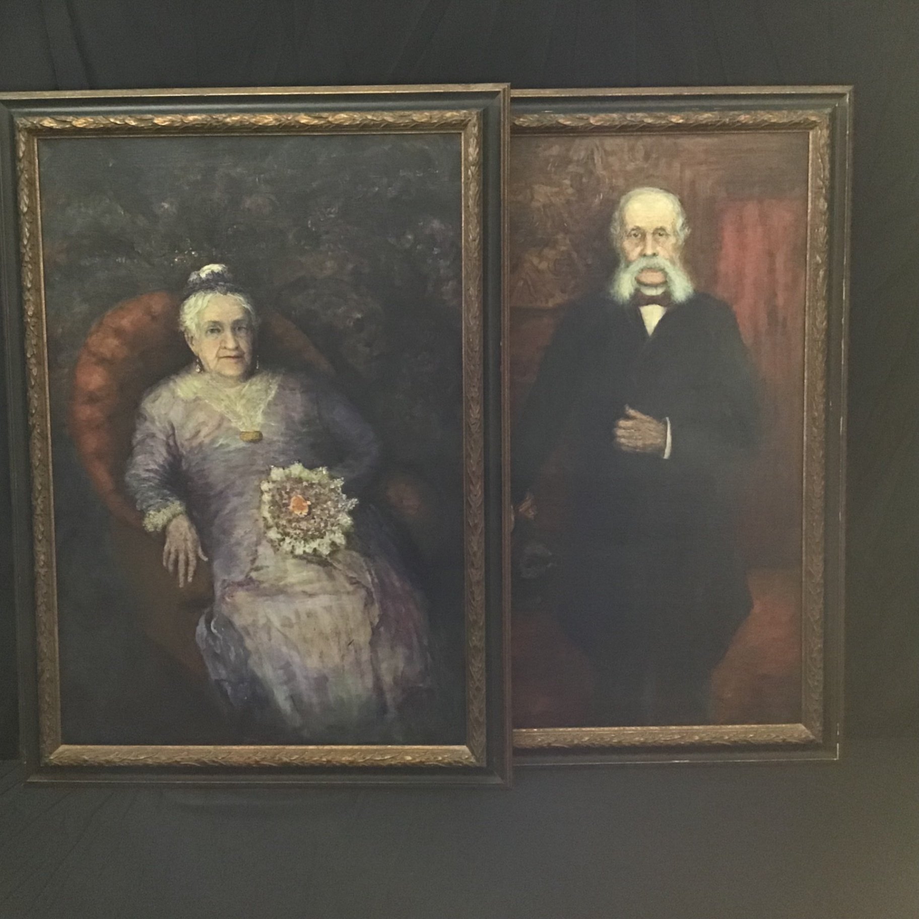 Adopt these large framed canvases of distinguished matron and gentleman. Acrylics on canvas, unknown artist, art 32x22, frame 36.25x26.25. 2 pieces.