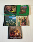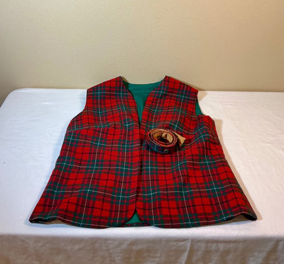 A collection of Irish-themed items including multiple music CDs, several Ireland/Celtic culture books (Landsapes of Ireland, Irish Blessings, The Little Book of Irish Clans, and related titles), a plaid vest sized large and traditional wind instruments (tin whistle with instruction sheet and a recorder).