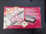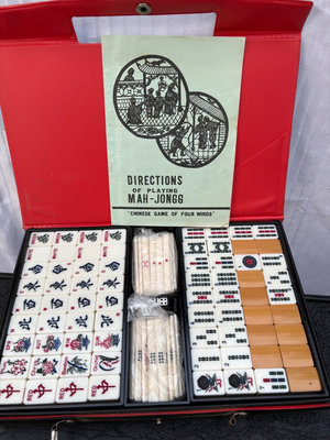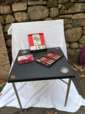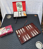Vintage card table, 29” square top, 29” height . Mahjong Set, Backgammon board and Dominoes Set