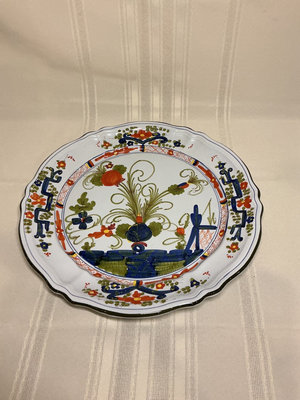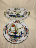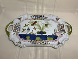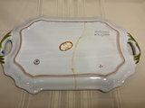 A pair of white ceramic pieces: a round scalloped-edge plate measuring 13” and a long rectangular serving platter with handles, both featuring multicolor floral and landscape motifs in blue, green, and red over a white glaze. Signed "Dipinto a mano, Made in Italy" means "Hand-painted, Made in Italy," a common mark on authentic Italian ceramics indicating artisanal quality, often found on colorful pottery from regions like Tuscany, Deruta, or Amalfi, signifying unique, handcrafted pieces with rich traditions, though sometimes it's just "Italy" or the maker's name, with the presence of the phrase or good craftsmanship being key to quality. As noted in the pics, the rectangular platter had to be repaired.