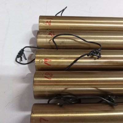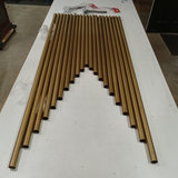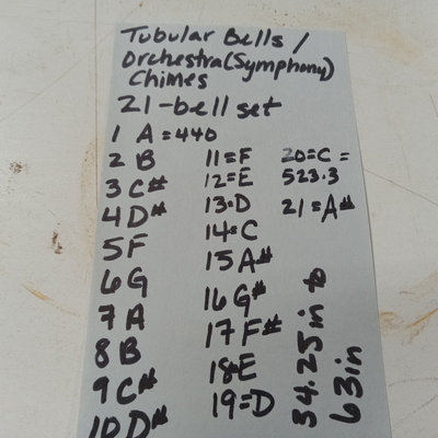 Tubular Bells / Orchestral (Symphony) Chimes, brass 21-bell set from A to A#, ranging in size from 34.25in to 63in. Made by J.C.Deagan Inc., Chicago, made in USA. The Deagan brand name was acquired by Yamaha in 1984, but the instruments are still in use and can be restored, with companies like Verdin and Chime Master working on them today. Includes 2 new in package Vic Firth chime mallets. Heavy, please bring appropriate vehicle and help to pickup. 23 pieces.