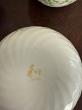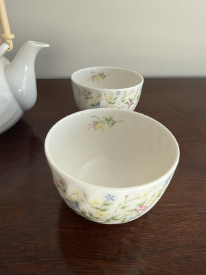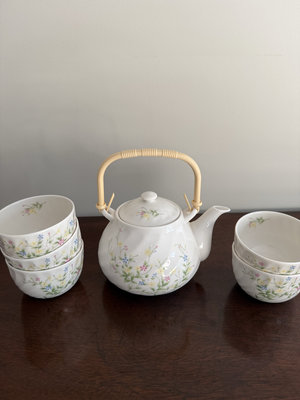 White porcelain tea set from Japan featuring a delicate floral design, including a teapot with a curved spout and bamboo-style handle and five matching cups.