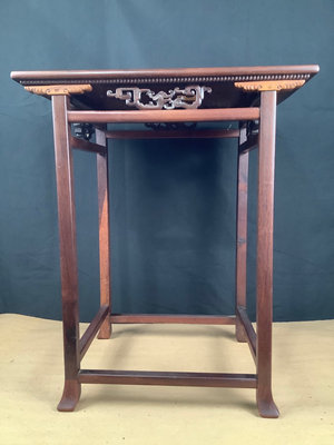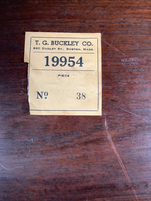 Small side table in the style of a Japanese alter table, oak construction, tag T.G. Buckley Co., Boston, made in Japan, 20x14x24. Top may have been re-married to base. Wear consistent with age. 1 piece.