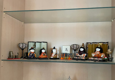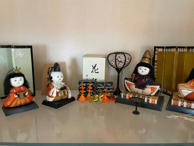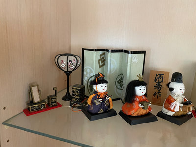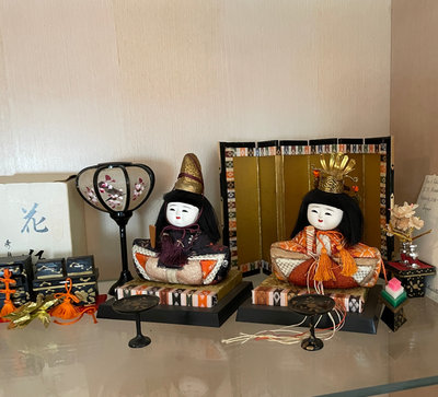 Vintage Japanese Emperor and Empress at court with meticulously designed Kimekomi dolls, painted room decor, screens, and more. 5 dolls and additional pieces.