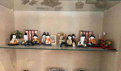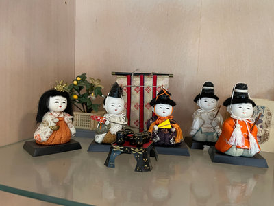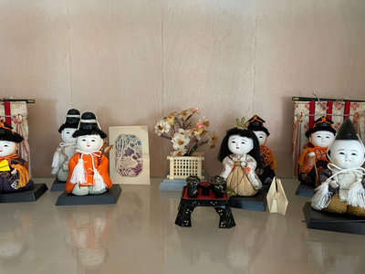 Japanese tea ceremony with meticulously designed Kimekomi dolls, painted tables and tea sets, plants, screens, and more. 10 dolls and additional pieces.