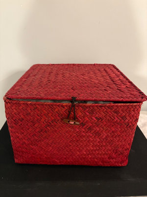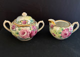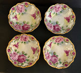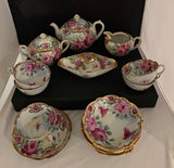Unmarked Nippon or Noritake moriage tea set in locking straw gift box. Only the teapot has a paper label. 5 teacups, 2 saucers, 4 nappy bowls, 1 relish 6” dish