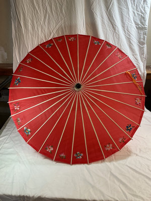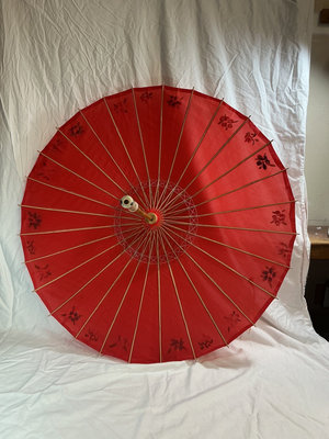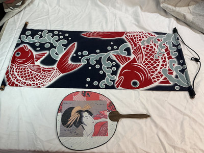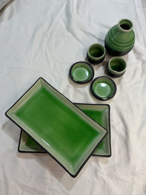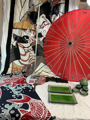 A collection of Japanese-inspired decorative items including a red paper parasol with floral accents, kabuki-masked wall hangings, a koi-pattern textile, a green-glazed ceramic dinnerware set (two rectangular plates and several small bowls/cups), and a wooden-handled fan featuring artwork.