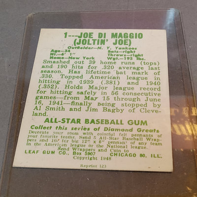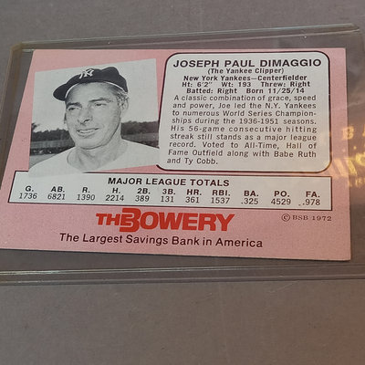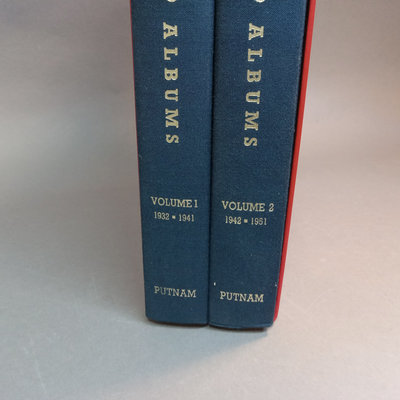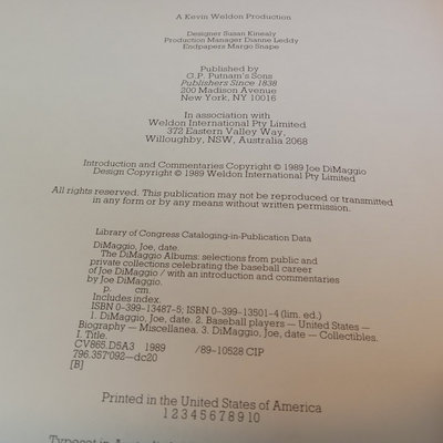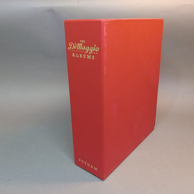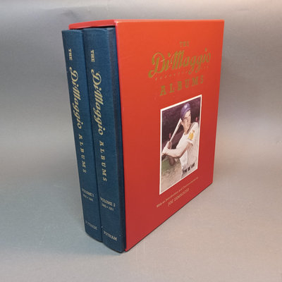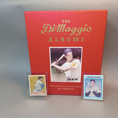 The DiMaggio Albums, 2 volume set in case, G.P. Putnam's Sons, 1989. 1948 All-Star Baseball Gum reprint card and 1972 The Bowery Savings Bank card with signatures, note pixels in close-ups. 3 pieces.
