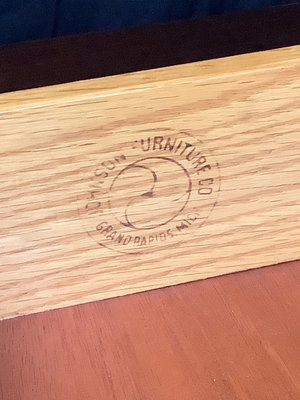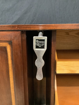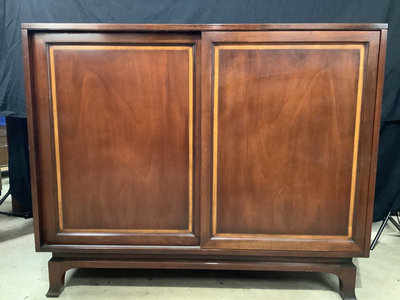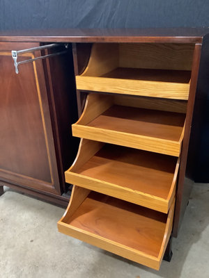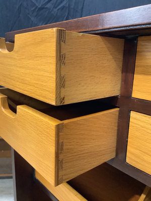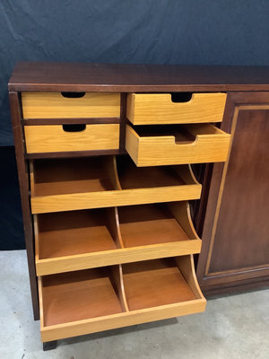 Sliding door bureau/dresser featuring Knape and Vogt of Grand Rapids Michigan sliding tie rack. Right side with 4 oak finish open drawers and sliding tie rack. Left side holds 7 oak finished drawers. Minor wear consistent with use. Lighting draws out top surface condition, consistent with age and use. 51x21x43. Heavy, bring help and appropriate vehicle to pickup. 1 piece.