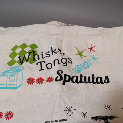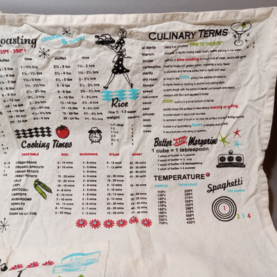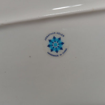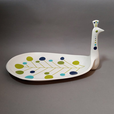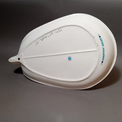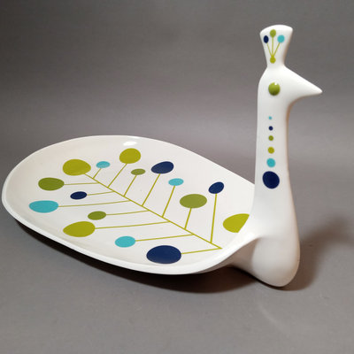 Jonathan Adler peacock tray, ceramic, 17x11.5, 9.5h, made in China. California Pottery crudite server on wood lazy susan, wood spinner is 13d x 2h, blue pottery bowl is 6.25d. Set/5 teal shot glasses, 4h. Cotton kitchen apron with useful measurements printed upside down - so you can wear it and pull it up to double-check! Blank journal for writing down thoughts and recipes. 9 pieces.