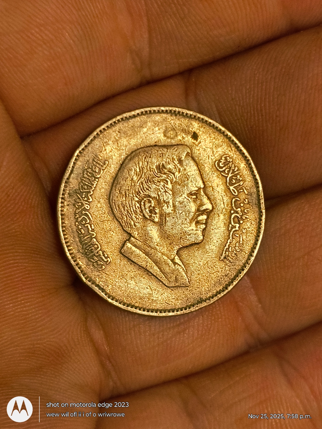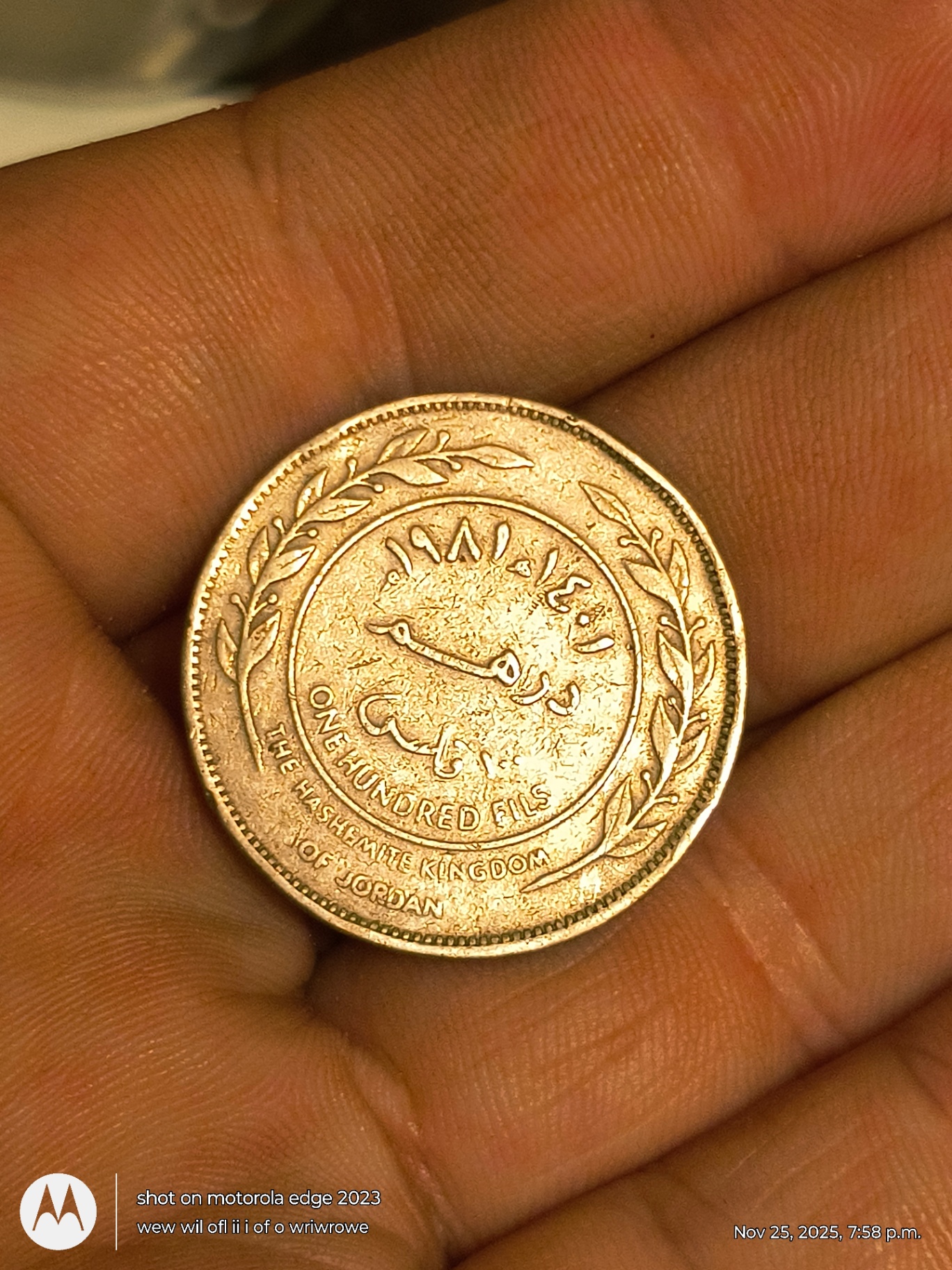 A coin from The Hashemite Kingdom of Jordan featuring a portrait on the obverse and a reverse design with the denomination 'ONE HUNDRED FILS' and Arabic inscriptions, encircled by a laurel wreath.