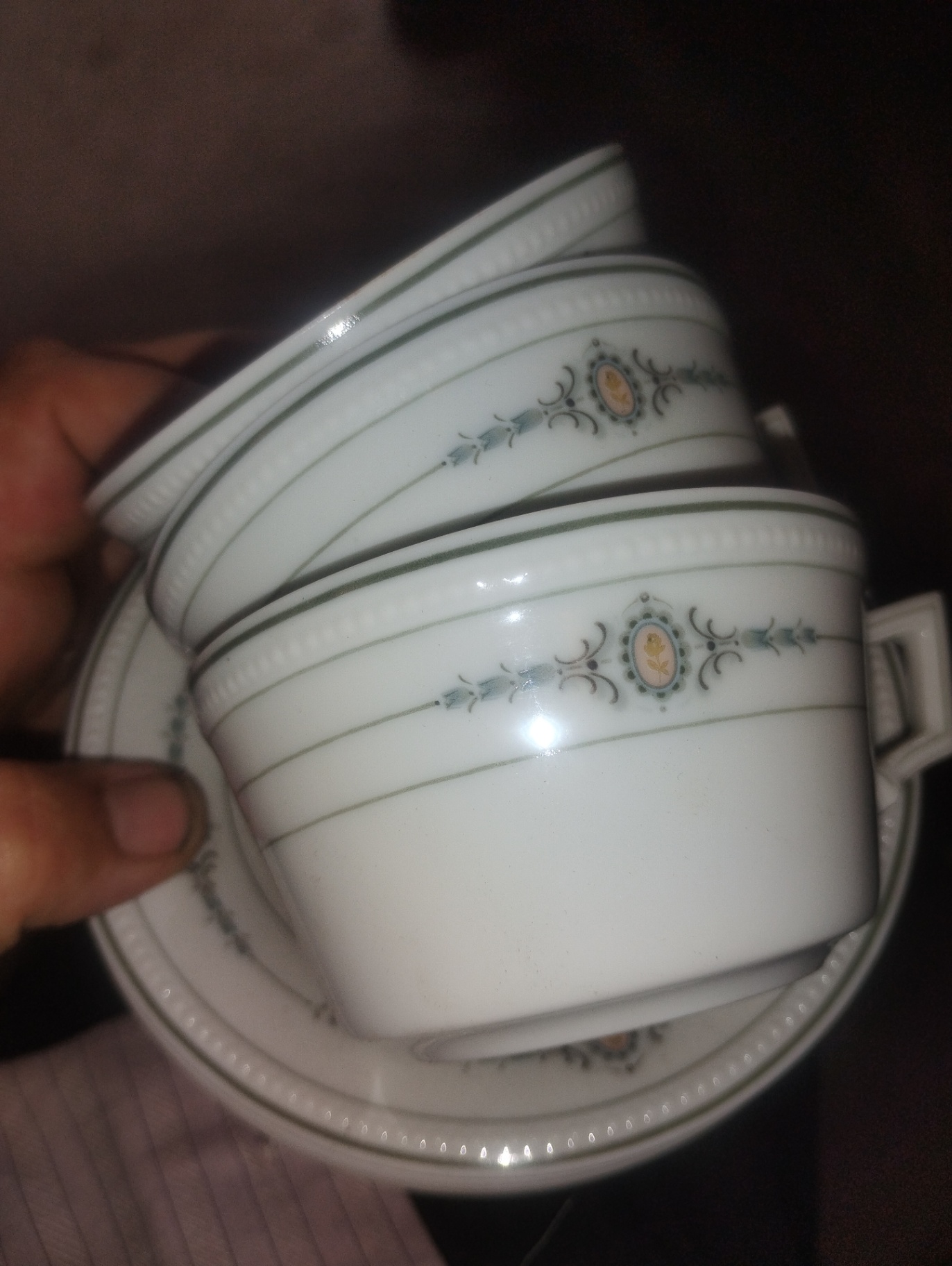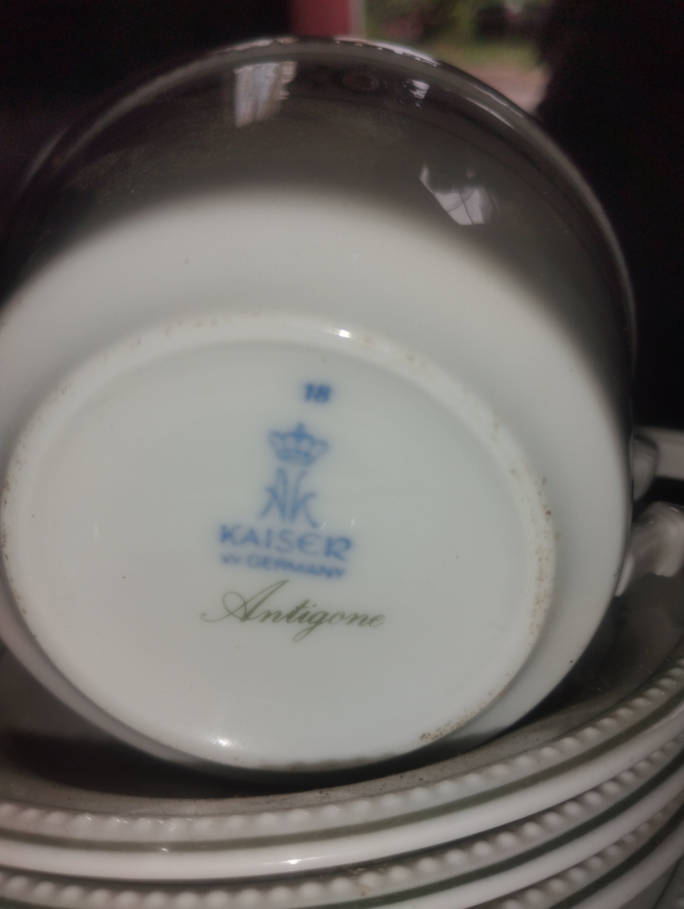 White porcelain dinnerware set including cups, saucers, and matching plates featuring a green border and decorative medallion motif. Backstamps read Kaiser Germany and Antigone.