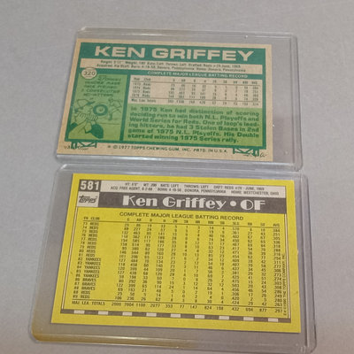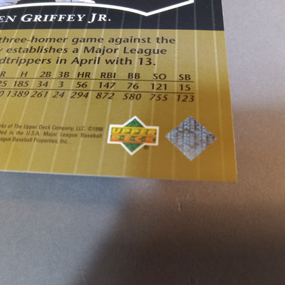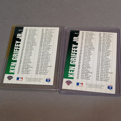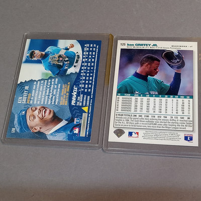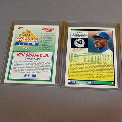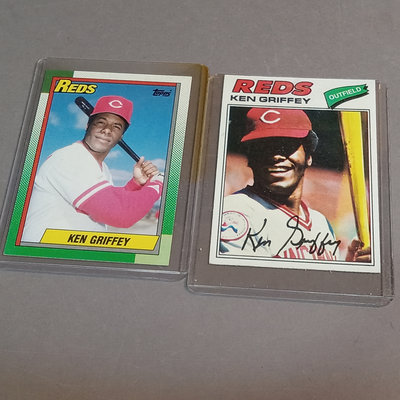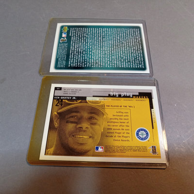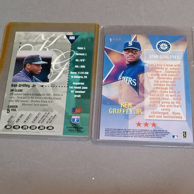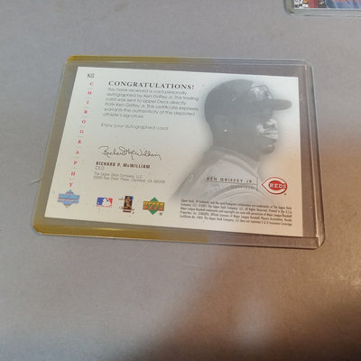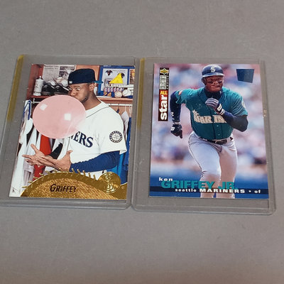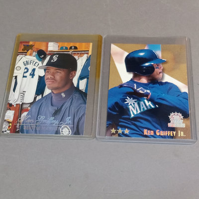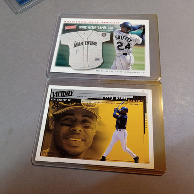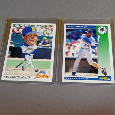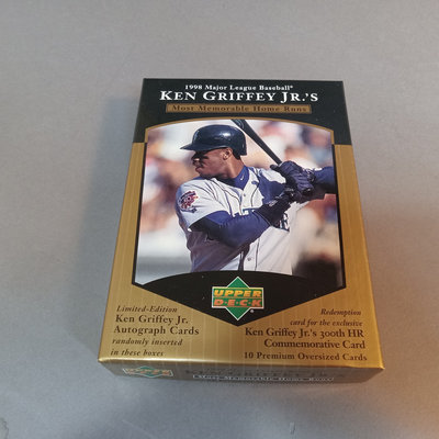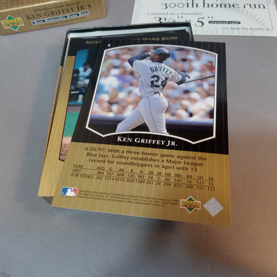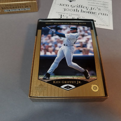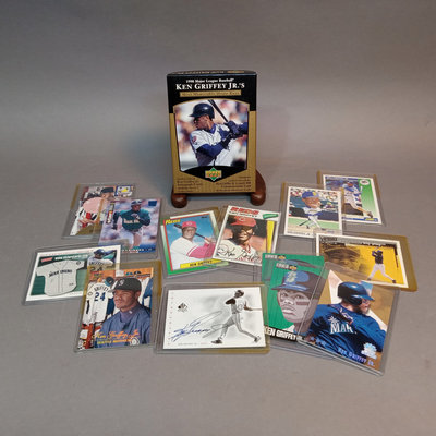Ken Griffey Jr. 300th Home Run Commemorative Box Set, oversized cards, from Upper Deck. 2001 Upper Deck Chirography card with Griffey's signature, plus Score, Upper Deck and more cards. 1977 and 1990 Ken Griffey Sr. cards. 14 pieces.