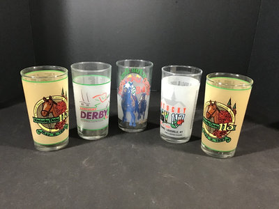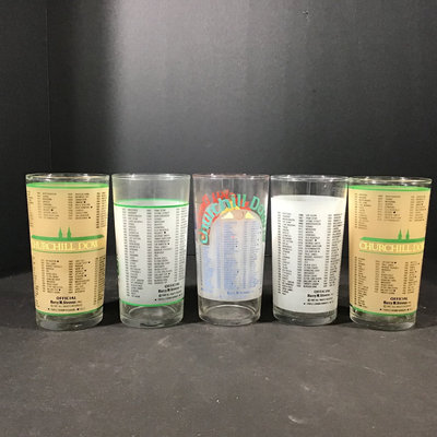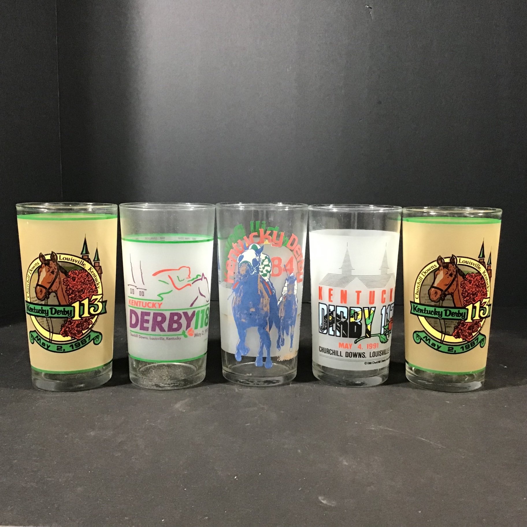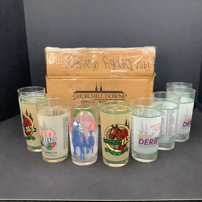Set identical with purple logo, 1992, kept in original box. 5.5h. Also glasses from 1984, 1987, 1991. 5 pieces.